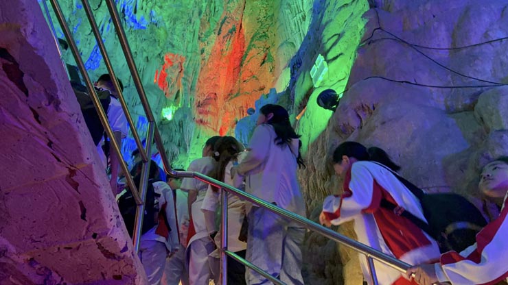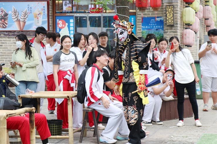 返程至慶都山?唐堯古鎮(zhèn),同學(xué)們興奮不已。先是走進(jìn)堯舜禹紀(jì)念堂,瞻仰先賢雕像,聆聽古老傳說,敬意油然而生。隨后漫步古鎮(zhèn),路遇戲樓,正上演精彩川劇變臉,五彩臉譜瞬間變換,引得陣陣驚呼,大家目不轉(zhuǎn)睛,沉浸其中??赐瓯硌荩直徽T人香氣的各類傳統(tǒng)小吃攤“勾了魂”,還在工藝品店挑紀(jì)念品。