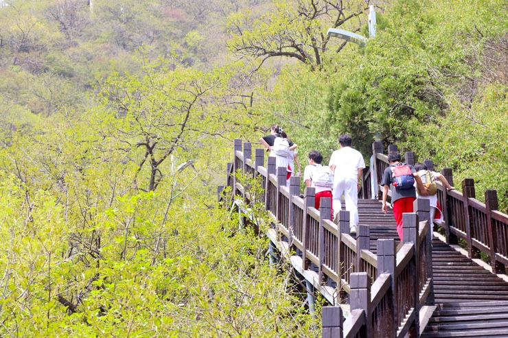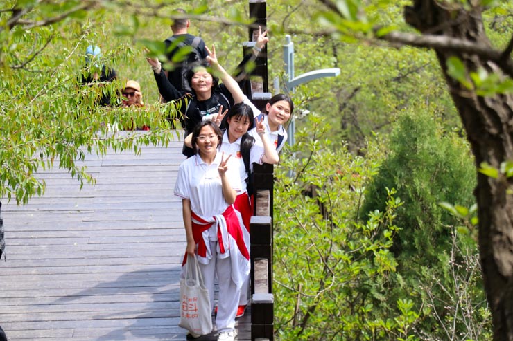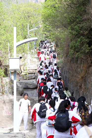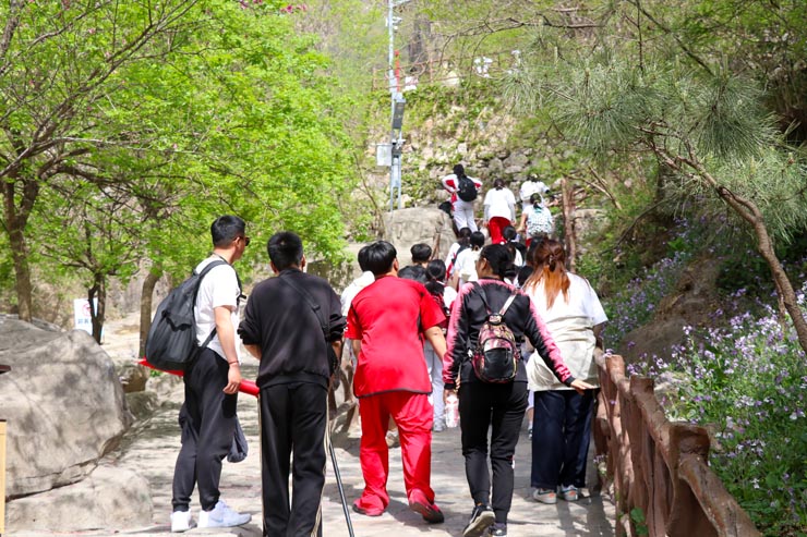 百花盛開,禽鳥和鳴。狼牙山早已換上了春天的妝容,到處是一派生機勃勃的景象。同學(xué)們以班級為單位,從五勇士紀(jì)念碑出發(fā),經(jīng)過紅瑪瑙溶洞,沿著蜿蜒的山路,拾級而上。石階兩旁,一花一樹,一步一景,滿眼浪漫的春光。同學(xué)們有說有笑,聊著校園生活趣事,唱著喜歡的歌兒,互相鼓勁兒。