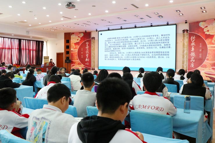 趙律師首先概括了習(xí)近平總書記法治教育思想,然后以“什么是校園欺凌”為切入點,深入淺出地講解了校園欺凌類型、特點、如何應(yīng)對及懲戒,讓同學(xué)們深刻認識到校園欺凌的危害,引導(dǎo)同學(xué)們學(xué)會識別欺凌行為,提高自我保護意識。