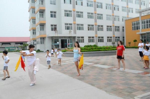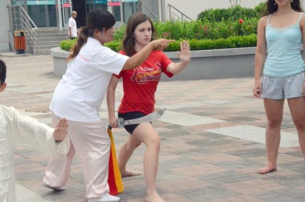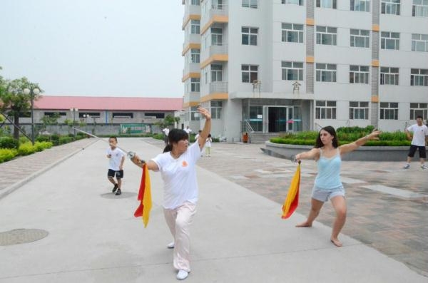 康福外國語學校的太極拳拳師指導外國友人學習太極刀。