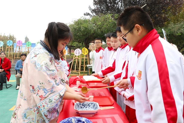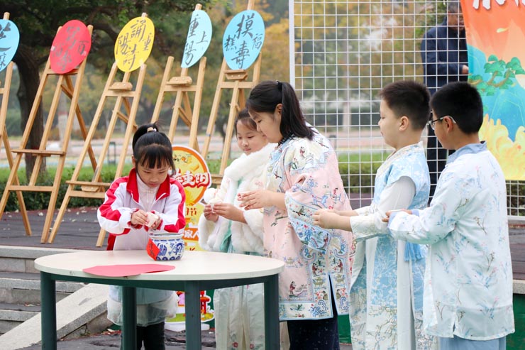隨后開啟的重陽游園會,融合了文化體驗、手工制作與趣味游戲。同學們品菊花茶、賞菊誦詩、插茱萸佩花冠、打香篆、寫百壽、剪紙拓印、制作茱萸香囊,在親手實踐中感受傳統(tǒng)文化的魅力。